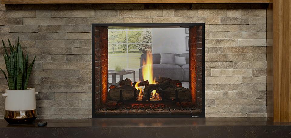 A warming Escape. This stunning see-through fireplace allows you add architectural interest and ambiance to multiple rooms in a creative new way. One fireplace, two rooms of enjoyment.
