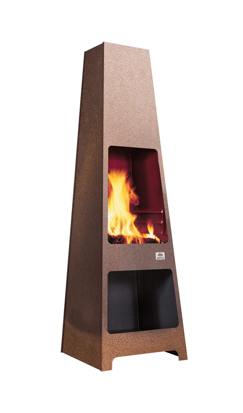 This outdoor fireplace creates – warm and cosy mood so that you can spend even longer evenings outside. Jøtul Loke lets you be close to the open flames with its tall and sturdy design – a robust fireplace that can be left outside during all seasons. It is designed both as – fireplace to provide atmosphere and warmth and to be used for grilling. There is also – base plate available, to protect the surface beneath the fireplace. The Jøtul Loke can be left outside all year round. It is available in corten steel finish that has – weather proof, rough and rusty surface.